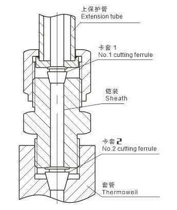 There are double cuting ferrules between upper and thermowell, making double-layer leakage-proof by tighteningthe screws and nuts. immersed in media, once thermowell of thermocouples and RTDs break, media will come outalong the thermocouples and RTDs lo cause damage.