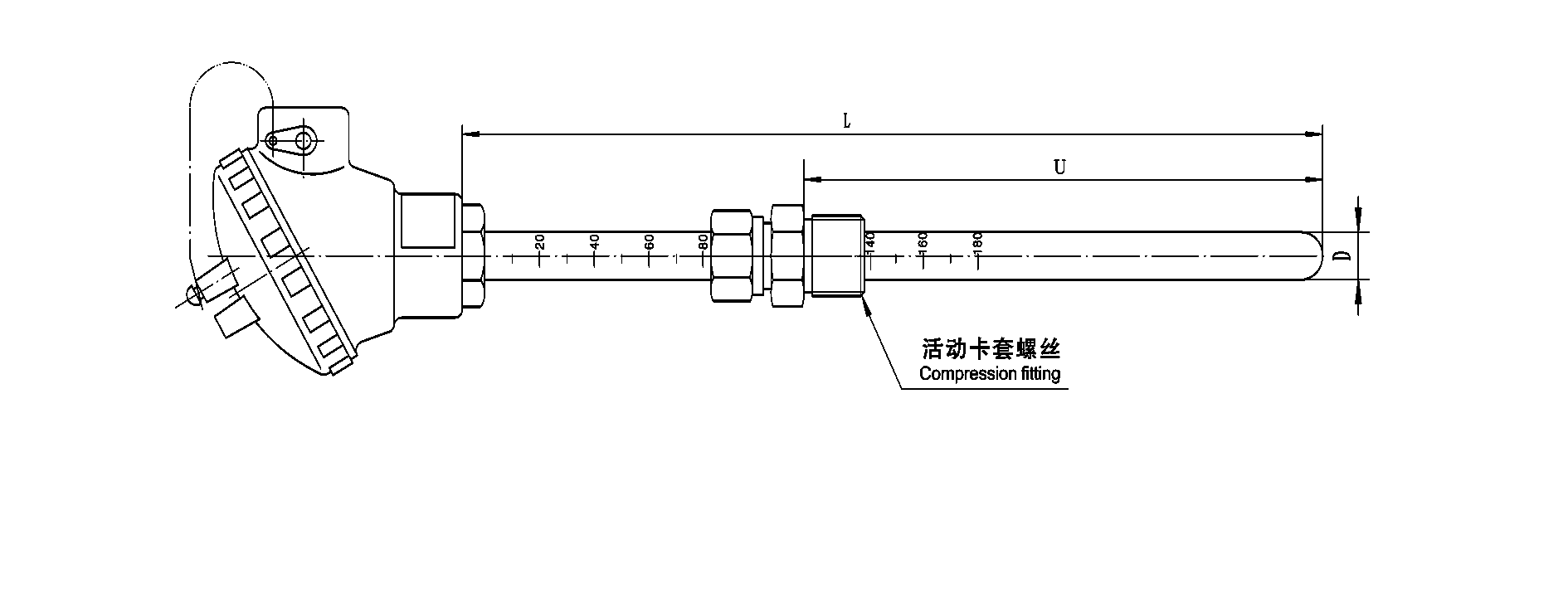 With scale on the thermowell, thermocouple or RTD is applicable to the occasion of low tightness.Insertion length is adjustable by movable compression thread.